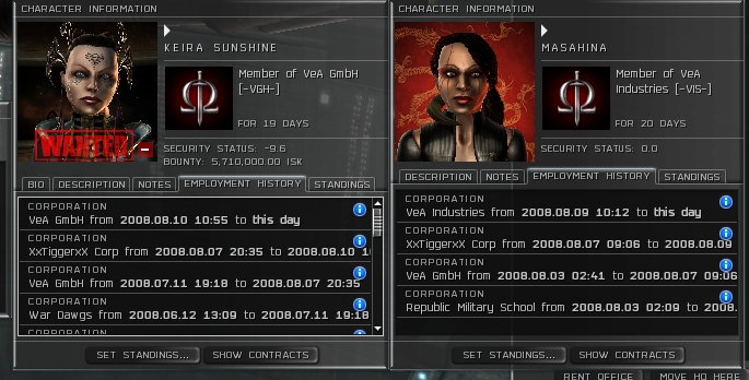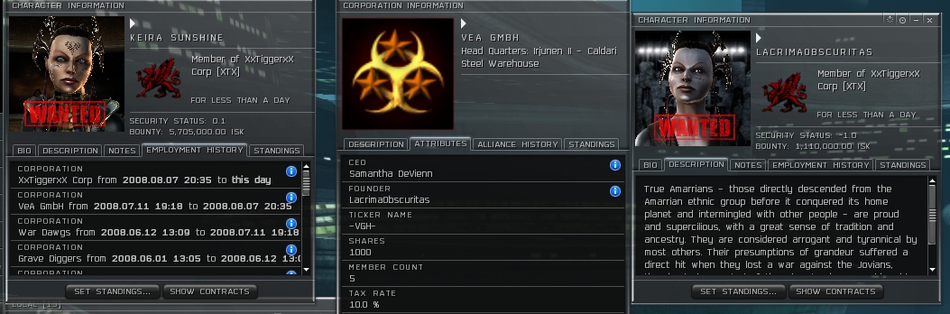 After a few days of making all that mad cash he quits his corp and I would drop him a line every few days asking where those evil benefactors were. He had a pretty good response....