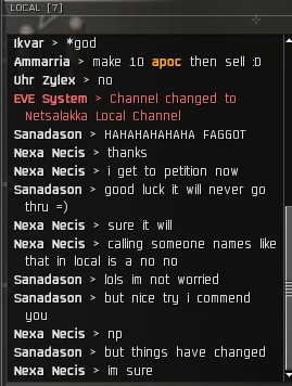 I always petition people using slurs like that in local. I don't mind that kind of chat in our corp chat, because we're all accepting of each others humor. However, in local, that type of comment could be very offensive to people. It is to me. It has no real place there.