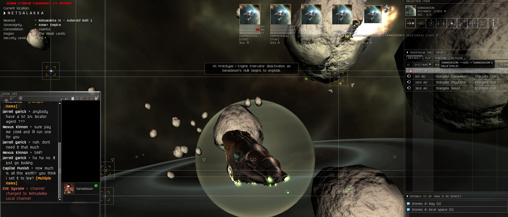 So I wait for him to get out mining in his new Hulk. I scoop up another suicide Dominix and head over to pay him a visit. Scratch another Hulk off for him!