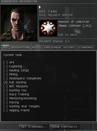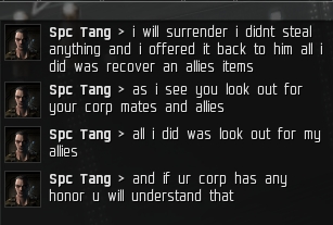 So we put in a dec against Tang's corp and put an alt in Sana's alliance to get a full memberlist. Tang turns out to be fairly predictable. He keeps trying to lecture me on honor as if honor somehow negates all his actions and means that he should suffer no consequences....