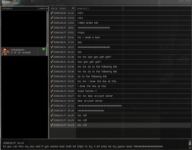 One of the corps lets him join and I let their CEO know we will be decing them and he learns that his new recruit brings death with him to their corp. Mind you the vote was put in and the war is about to go active and he knows we mean business now and says he will kick Sanadason. So the CEO drops me a line. His name is Clock.
