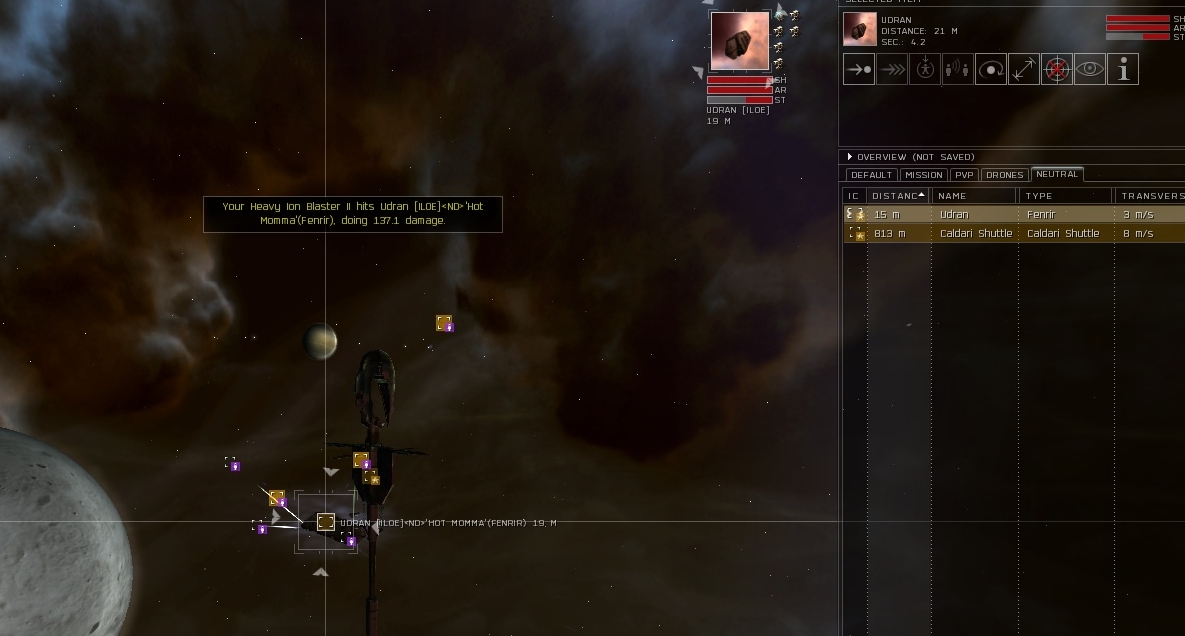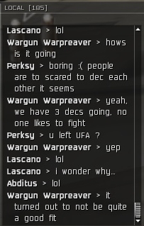 One of them was bragging in local how they had 3 wars going and no one wanted to fight. Which was quite amusing given the encounters I had with them, they all dock the second any of us go into the system. Or they logoffski when they're about to be caught. Keep in mind this is a guy from Vengeance Ascendant's sister corp, Vengeance Imperium. They decided to dec us one they were out of their alliance. Their other corp can't fight their own battles.