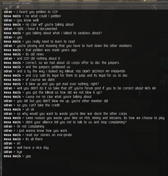 Nexa Necis > again, you decd our friends, then your corp smacktalked, logoffski'd etc, so we're gonna keep the dec on