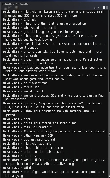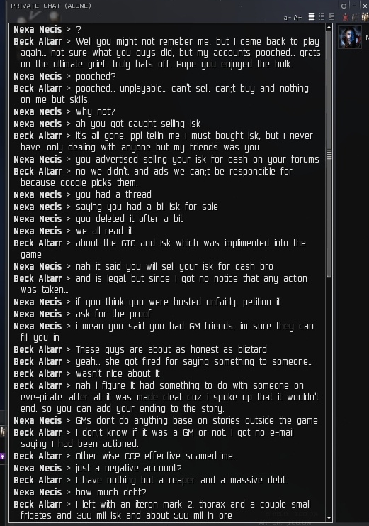 So he is blaming me for GM's giving him a negative wallet balance. What an idiot. Believe me, I had a GM in my pocket I would have them work some magic on my wallet as opposed to someone elses I assure you. I am so glad I was the catalyst behind him and his family and friends quitting Eve and joining WoW.