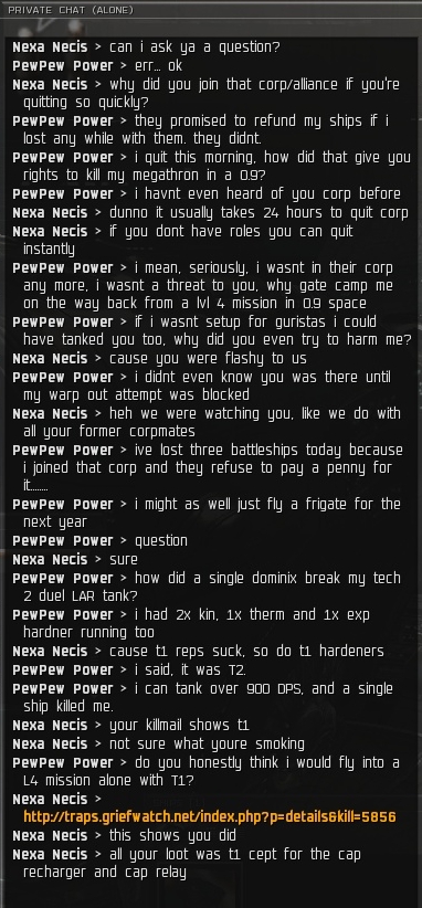 I also love his comment of how he wants to know how I work. I get this a lot. It's a charade of sorts. They play the role of curious when actually it's a thinly veiled attempt to probe me for anything they can use against me. As if I am going to say, "I do this because my corp sucks and we can't fight anyone who can pvp back." That's the answer they're looking for, which is stupid because it would mean they just got a severe beating by someone who admits they suck.