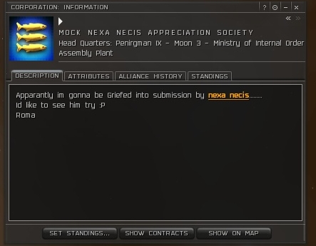 Roma is a complete asshat. He names all his ships "Nexa=failsauce" or "TRAPS=epic fail". Even when he was retarded enough to uncloak his Falcon at point blank range instead of optimal and we popped it,he shouts in local...