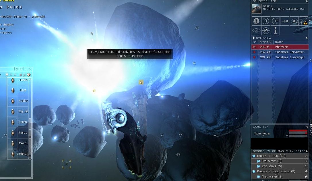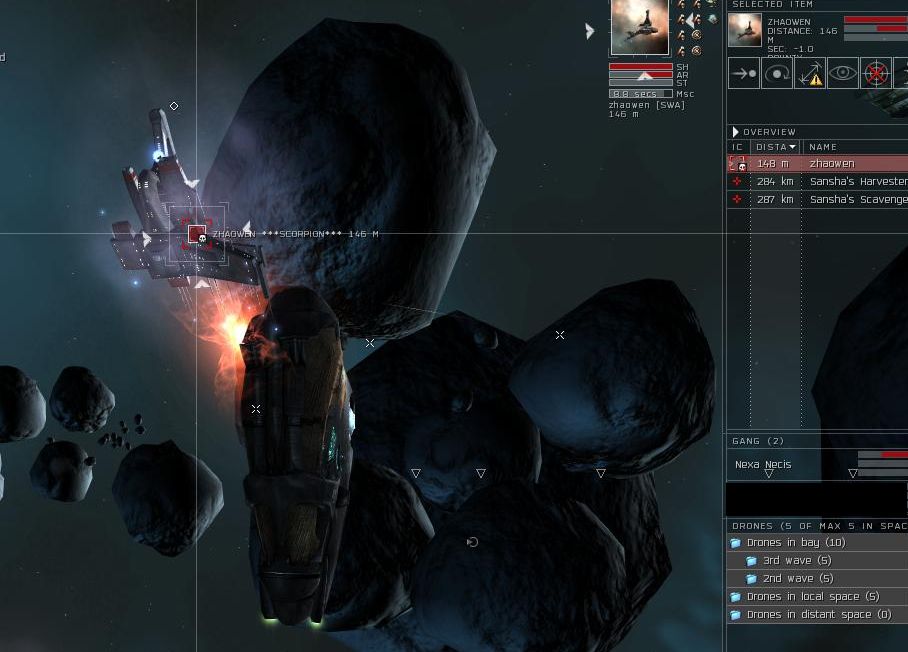 I warp into the belt and land directly on top of him. I proceed to disrupt him and jam him up the wazoo. I launch my heavy drones and they get to work on him as does my array of nosferatu.