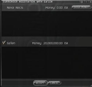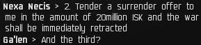 So at this point he wants to talk it out rather than fight. I enjoy roleplaying so I indulge myself a wee bit. The conversation starts in local chat. A few people familiar with my exploits chime in with some witty banter. We take it to my favorite channel, IHATENEXA. There we share more words. He asks how we can end the hostilities betwixt our corporations.