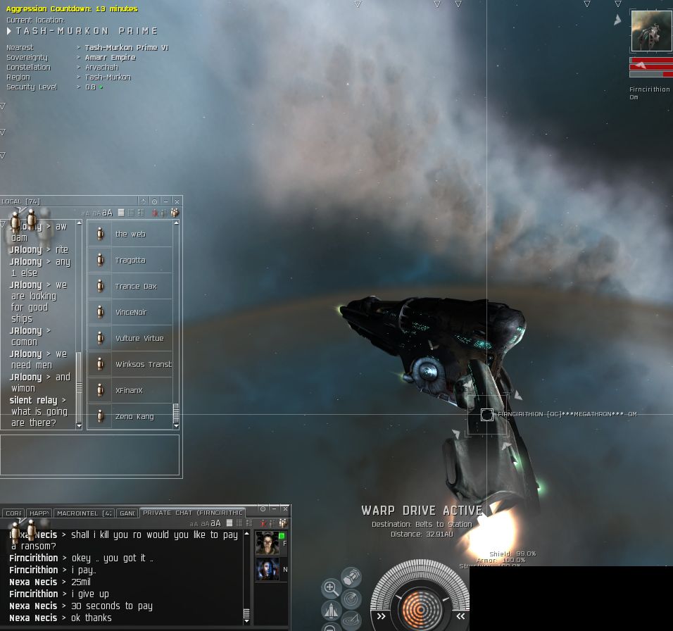 I, of course, honor the ransom request and warp out leaving him to his own devices. I was going to war dec him but I am torn. One half of me feels guilty because he was a good sport unlike most of the people I meet in game. So I give him props for actually coming back to fight and having some fun. He even half-expected to lose, but he wanted to test out his ship.