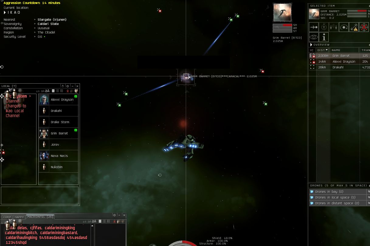 A few seconds later the CEO in the Caracal jumps over and hes about 12km from me. I zoom in and go for the kill.