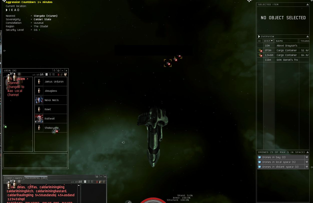 He of course then whines on that he's a newbie and I am a big bad bully for picking on him and his other friend and all that good stuff. I asked why would your corp threaten to war dec us if you weren't prepared to back it up. It seems the CEO didn't really keep his players informed of his actions so this guy and his friend suffered some losses. He tells me he is pissed at the corp and wants to leave them along with his friend as well. So I tell him how to go about it. He quits it.