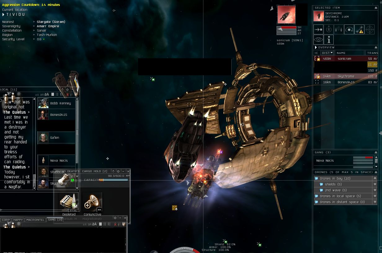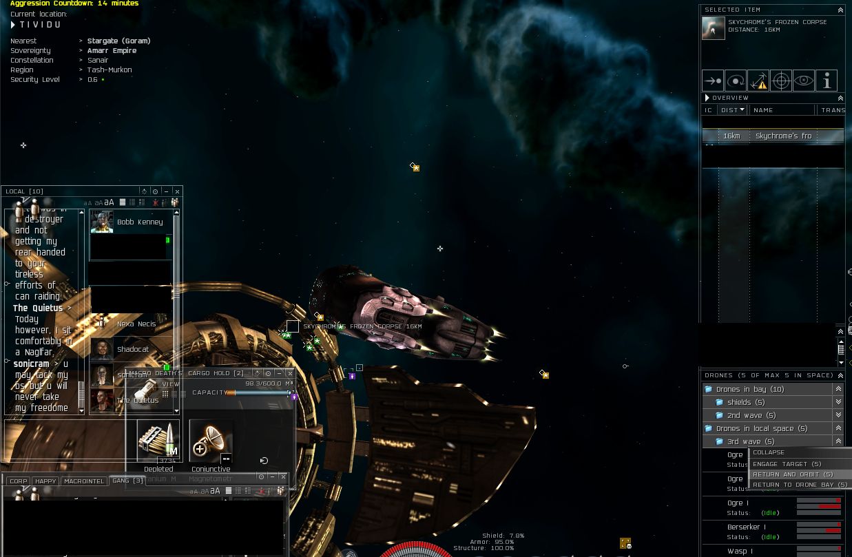 I warp to them as they hover at the Tividu/Goram gate. I land right into the thick of them......