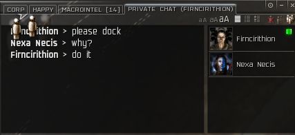 A moment later in local he directs me to an elder member of their corp. I convo him and he's pretty cool. We get to talking and he confirms that we are going to be annihilated by some alliance and some sister corps or something of that nature. I didn't quite get what he was saying, he kept mentioning leaving corps and quitting roles then they would be prepared to kill us, but for now they're just watching and waiting. He also informed me that their corp is a "training" corp for some 0.0 alliance and they wont be surrendering as this is good training practice for them.