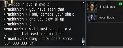 He certainly is a chatty fellow. He informs me of the total amount of ISK the war has cost him. Now I know why he wanted to pay earlier. He had a nice set of implants....