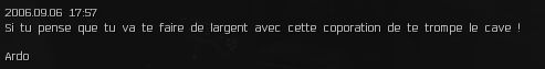 The next day one of the other corps we dec'd sends me some smack talk or something. It's in French so I am not sure what he's jaberring about. Something like we wont get money from them or beat them down or something...
