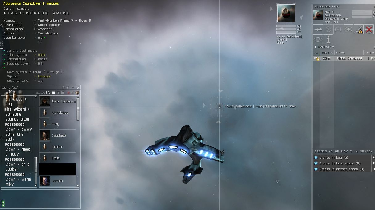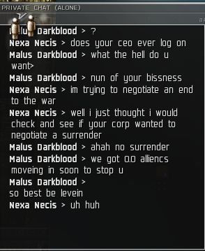 So much for that corp I guess. So later in the day I see Malus in local. I convo him and ask him where his CEO is as I'd like to get a surrender in the works. Once again the ever popular alliance war dec threat comes into play....