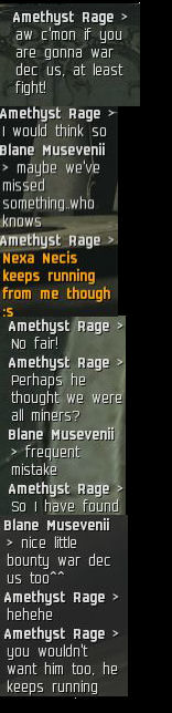 Then something odd happened. We got war dec'd by a 0.0 pvp startup corp. No reason given, none asked for. The funny thing was they also war dec'd Vatta and another corp located in Pimebeka.