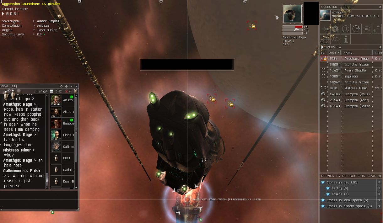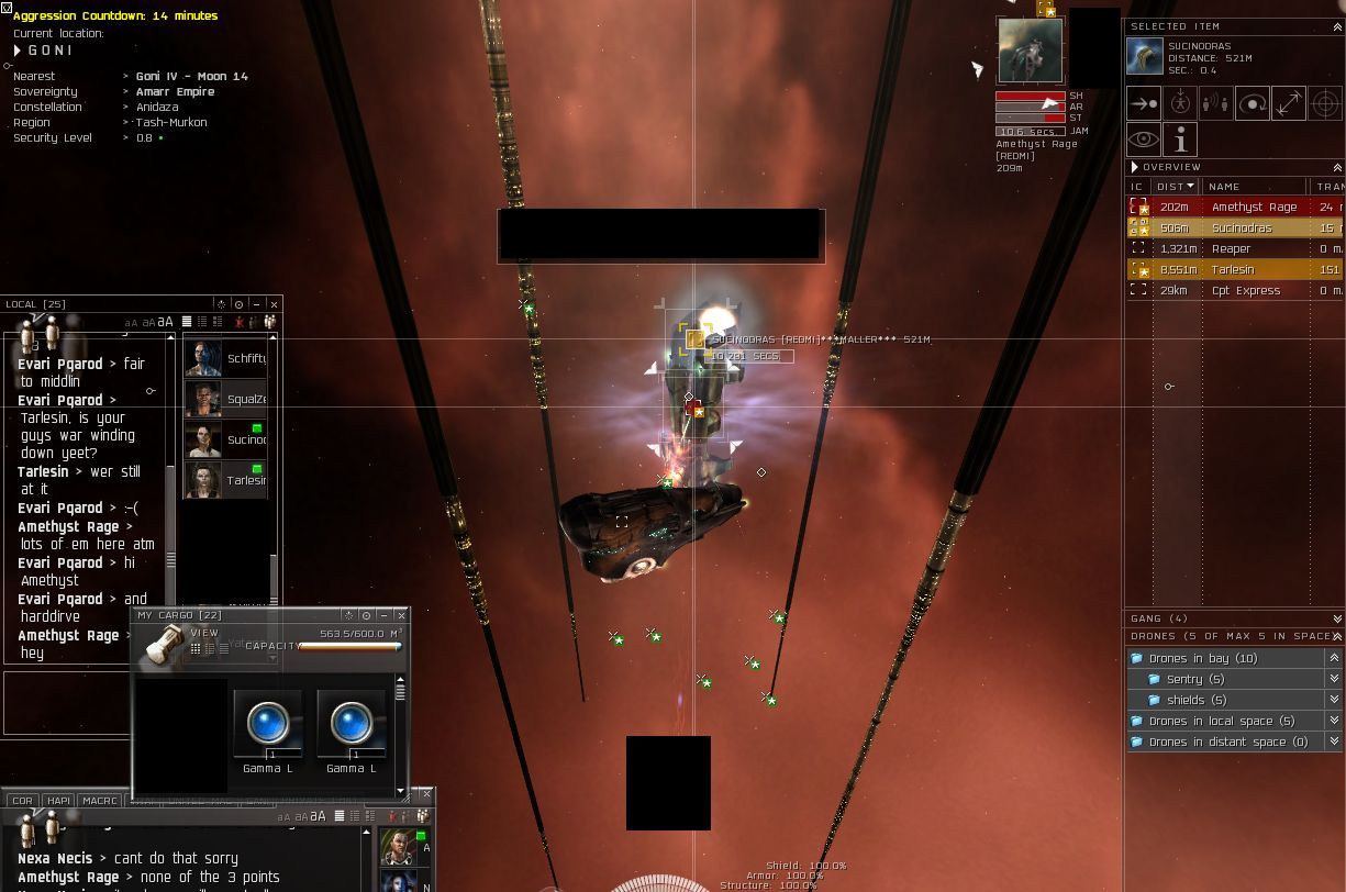 I am tired and decide to log for a while. I come back a few hours later and see that Amethyst is in Goni again and there is another mate of theirs there as well. This time I have my Thorax. I undock and Amethyst is in her Megathron and Tarlesin is in a Vengeance.
