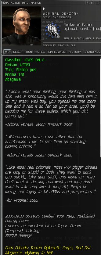 To summarize I think this Admiral Denzark is just someone who doesn't care for anyone, but himself and I wouldn't be proud of having him on my team if I was either a pirate, carebear, miner or in real life.