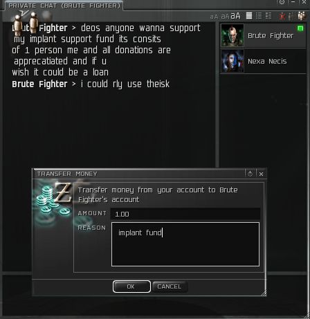 He knows he can't win, but he asks to duel my Ishkur in his Kestrel as long as I don't pod him. I agree, he pops in 3 seconds, and I keep my promise not to pod him and even let him take his gear which he picked up with his Ferox. Must be nice to have 100mil in ships only to tell people you are broke. :)