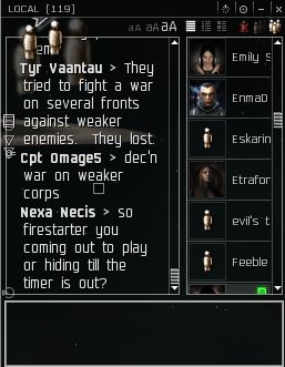 [ 2006.11.20 04:23:48 ] Nexa Necis > well we will be attacking all of your corp though, not just him