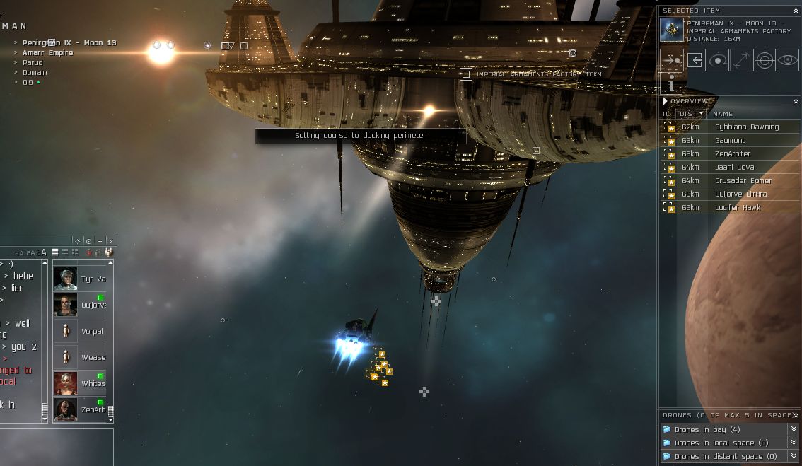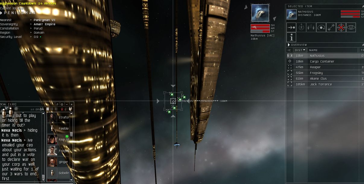After about 20 minutes of Peregrin's posturing, one of Peregrin's senior officers convos me. He is quite rational, respectful and quite aware, "it's only a game". So he is a pleasure to speak to compared to some of the raving lunatics I usually get.