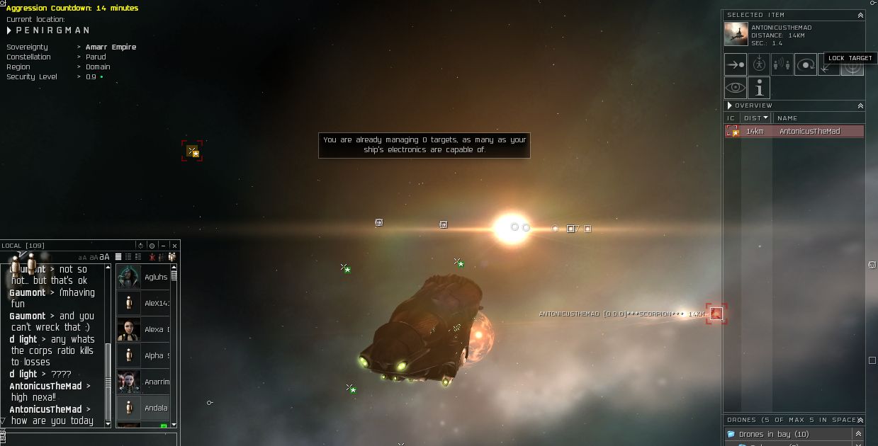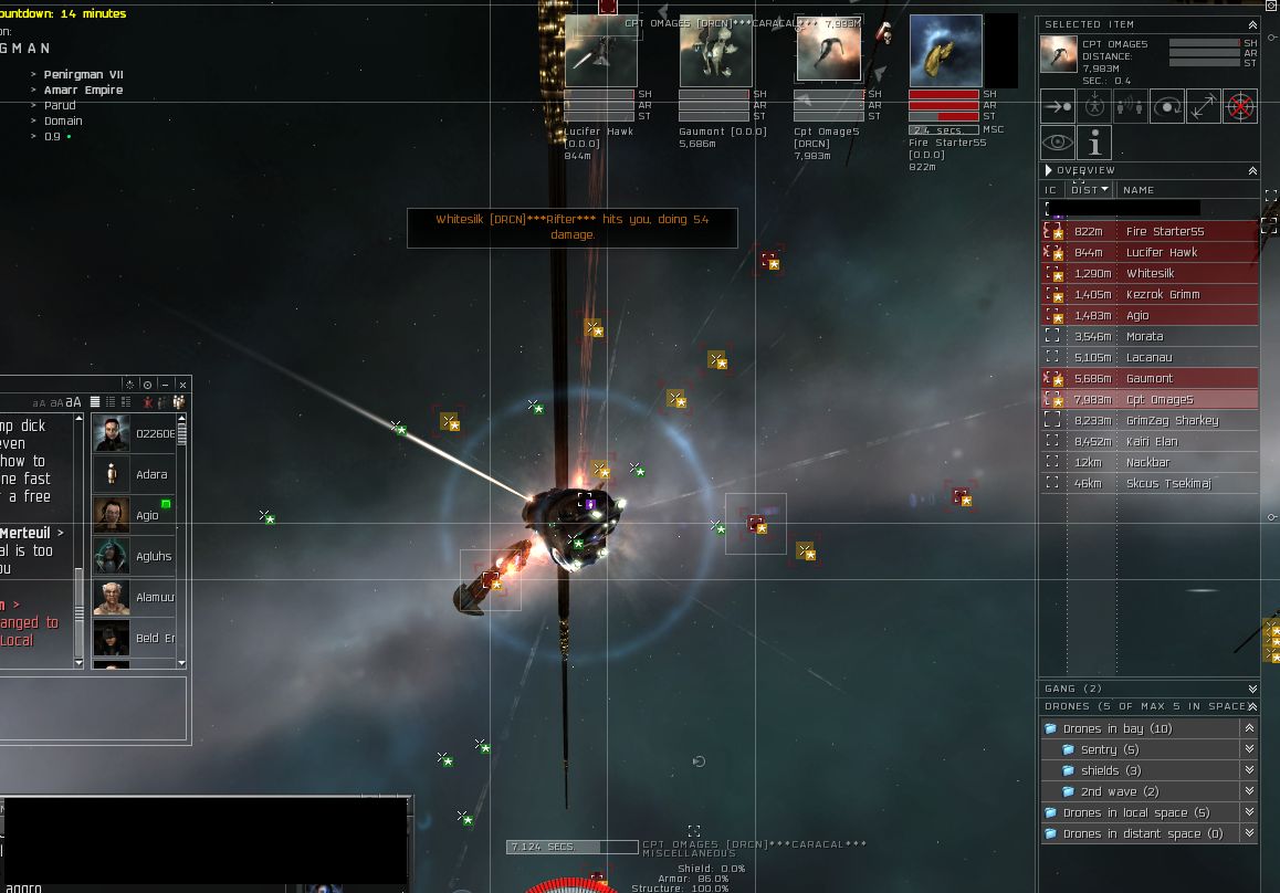 Now at this point I've stirred up a hornet's nest. Several Peregrin guys start entering the system and several Draconian guys also are there. They all undock and orbit me. Mind you, the wars with them haven't even started yet and my timer was out so it's not like they could do anything to me. Notice the local chat with Firestarter55 asking what's going on? Keep an eye on him for later. :)