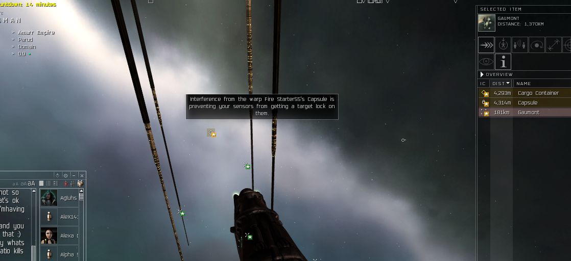 While they are intent on orbiting me endlessly, I decide to check on the can I swapped earlier. Sure enough just as I warp in the belt, I see a red flashing Bestower belonging to Firestarter55. I almost pop him at the station but he had an insta that barely got him docked in time.