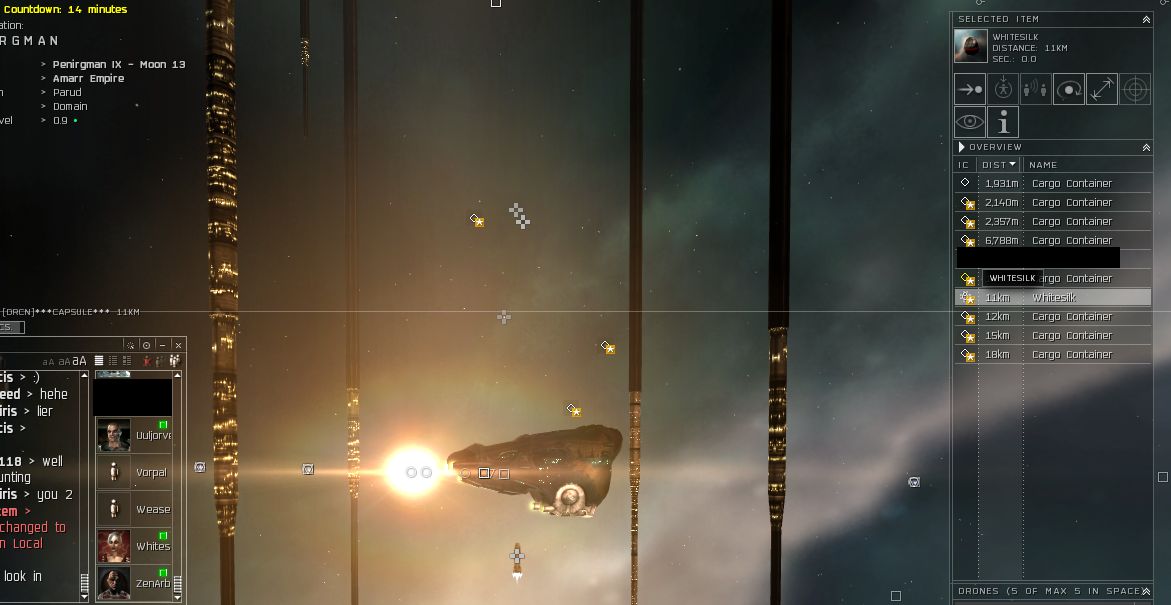 A few belts later I stumble upon a mining op by Peregrin players. There's a few cans but no players around. So I swap the ore to my can and wait. 10 mins goes by and nothing. So I head to the station housing their HQ. None of them are there.