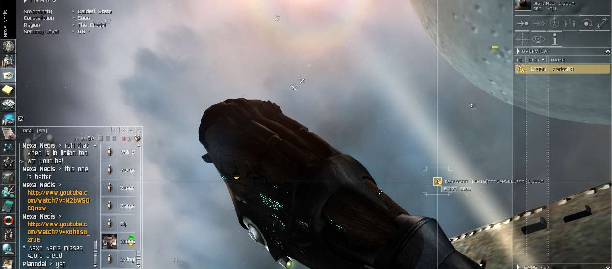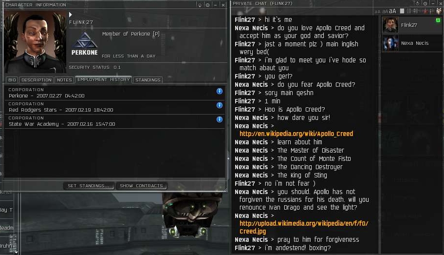 So in between them docking in their frigs and me popping and podding them with my Domi, I would link Youtube videos of the Apollo Creed vs. Ivan Drago fight.