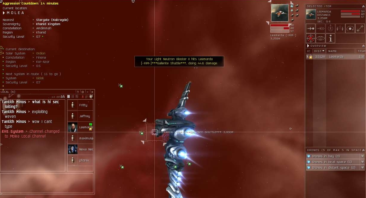 Of course he tosses the old invite, "come to low sec". Allow me to translate that for those who aren't familiar with carebear whining. It means, "Come to low sec, because I have friends/anti-pirate types here who will help me kill you because I can't do shit on my own, and I am not going to war dec your corp, because then my friends won't be able to really help as much as if you came to low sec and we blobbed you."