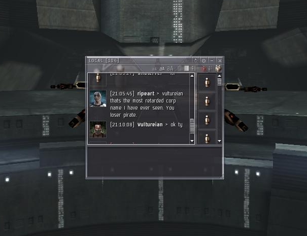 So he's saying their goal in corp is to get a bad rep among pirates? An odd goal to be sure. At this point one of their corpmates convos me and seems to agree that dishonoring a 1 vs 1 is a shit move.