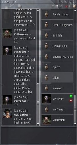 Now you would think after 18 deaths by our hands, she would leave their corp. I mean, none of them ever log in for long, none of them hang out, and according to former members, Verzeder is non-English and rarely even talks in chat. So what's the benefit to sticking around? My honest opinion is they are an ISK pharmer hiding in a regular English-speaking corp, which helps them avoid attention and harassment usually.
