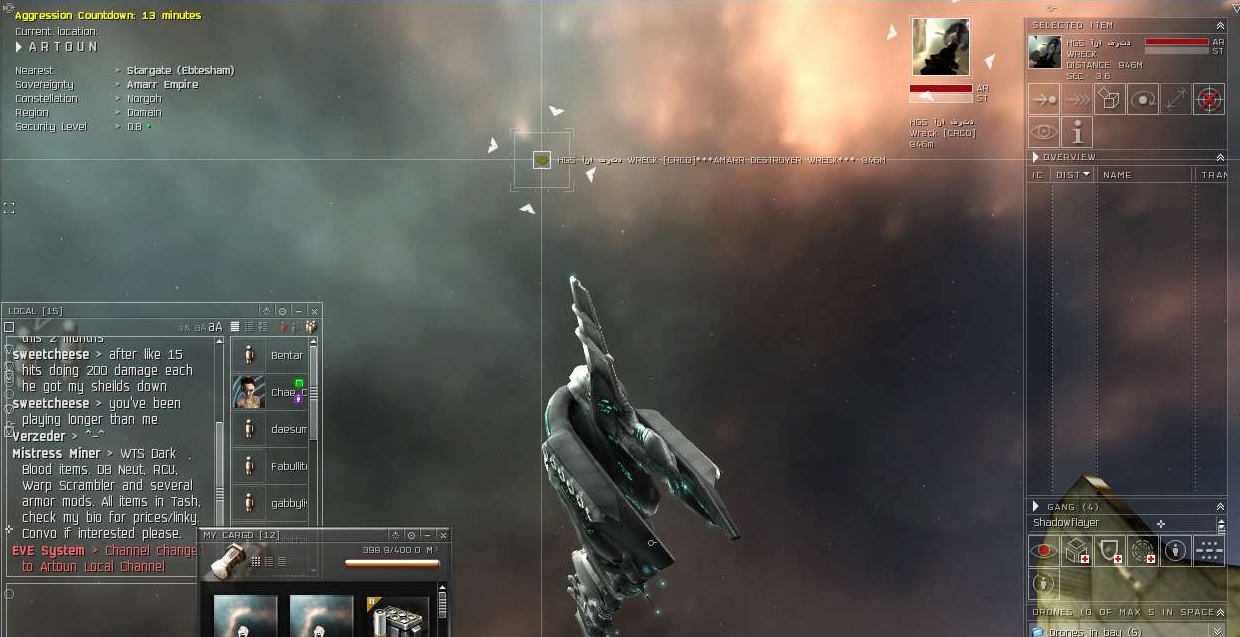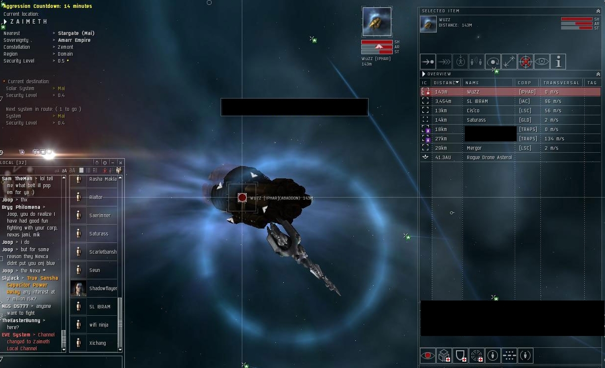He tells me what's up so I head to the belt. I'm sitting there alone and sure enough, the one corp isn't flashing but they are "flexing" their muscle with a Raven as backup. I am in my Domi and my corpie is in his Hurricane one system over.