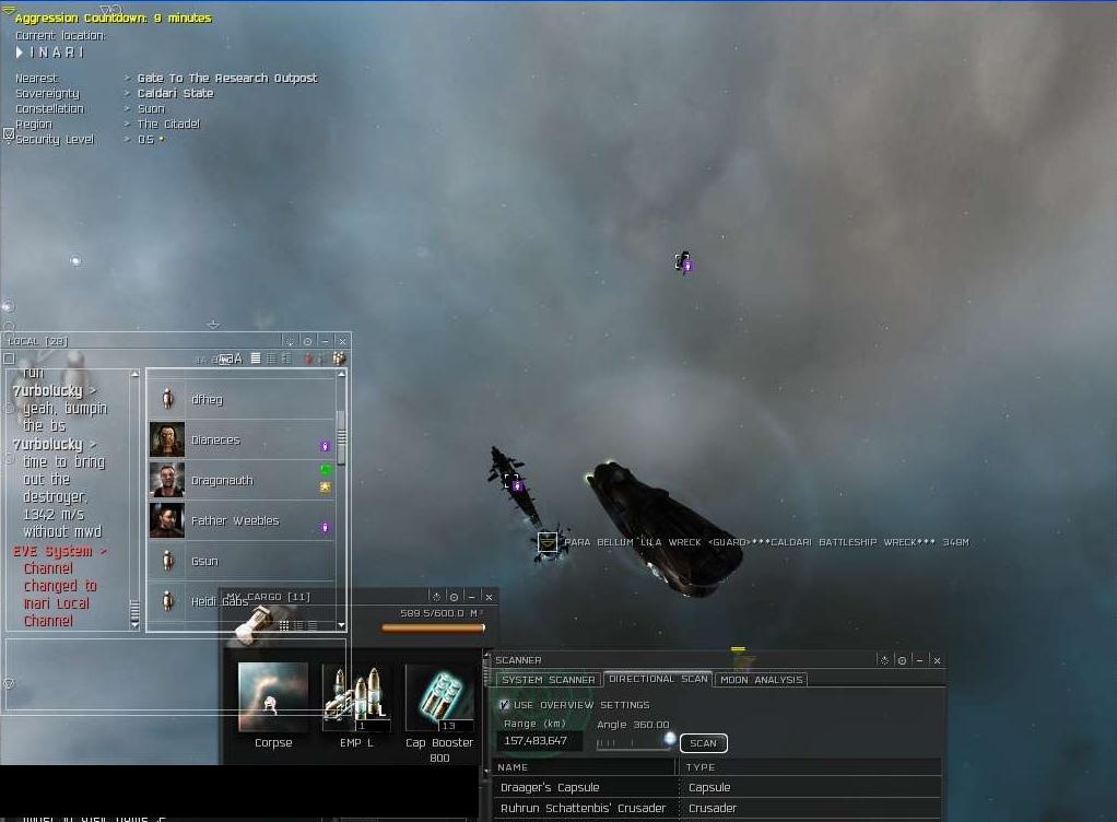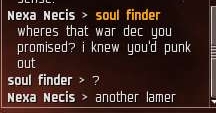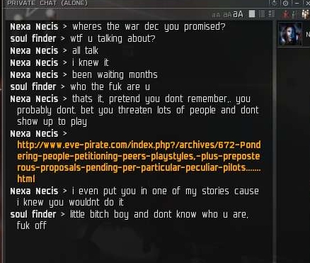 At the time I was camping war targets in a 1.0 system while Soul Finder was baiting newbies with loot cans in front of the main station. He just starts talking shit like no tomorrow. Going so far as to promise me a war dec.