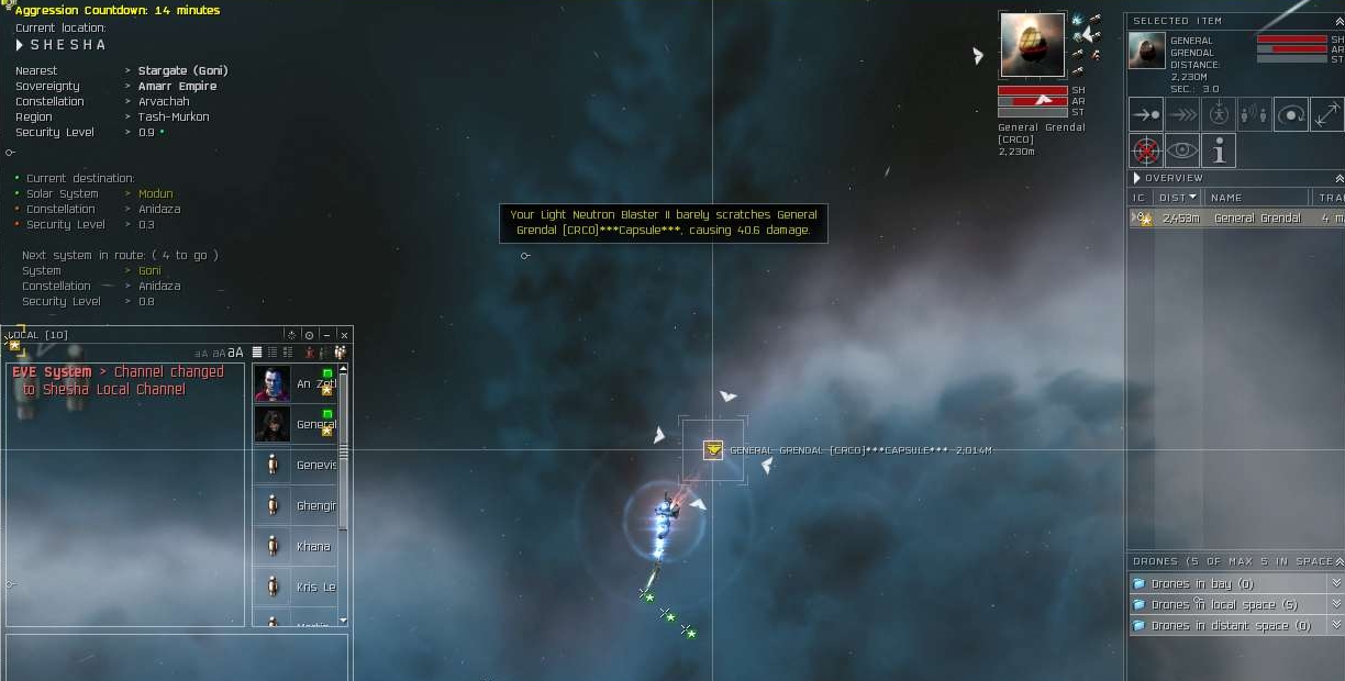 The really sad part was he ejected! He was in low structure and as usual, my drones did not respond to my repeated commands to stop attacking and return to their nest. So his ship went pop. :( We did manage to get 20-30 mil of loot off it though if I remember correctly.