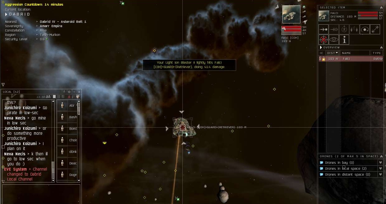 Then you have people like Falci. He showed up for a few fights and died in each one. He lost a Typhoon, Jaguar and a Hurricane. Now I catch him in his Retriever mining. Luckily I was in my Taranis so I was able to pop the Retriever and snag some pod action.