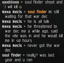 [ 2007.06.17 21:00:39 ] Hans Gates > I hold you responsible for the war, we DED'd RIM for smack talk, you took them in, we take that as a act of aggession.