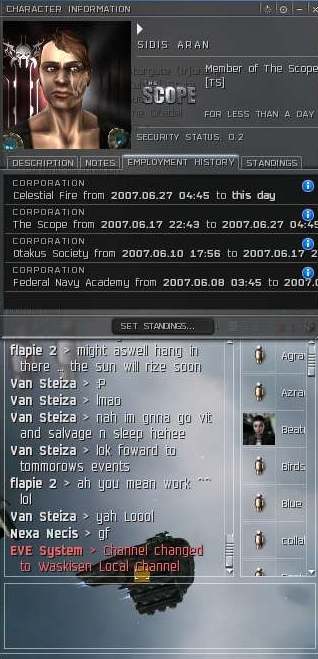 [ 2007.07.15 16:53:13 ] Nexa Necis > well lesson learned, dont join a corp with a bio that talks about taking over eve with force