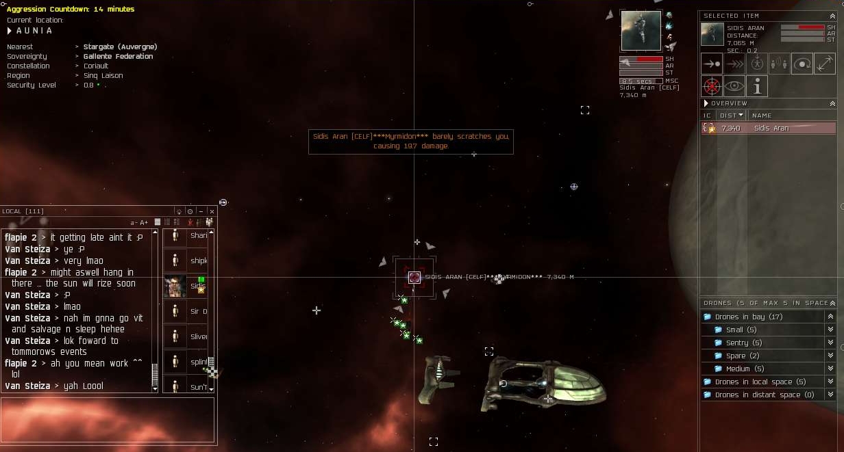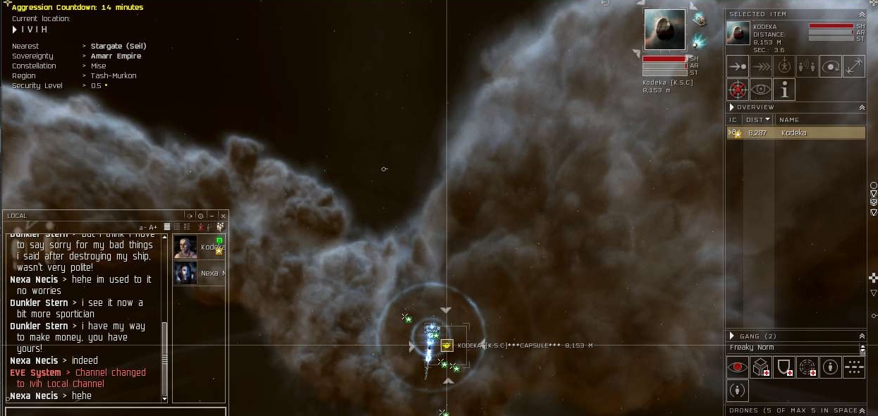 "This guy with a bounty was flying around while I was mining one night, I was bored so I thought I'd do some small talk. He has a bounty which usually means a pirate. Well I am in safe space so he can't attack me with out getting into trouble with the space police CONCORD."