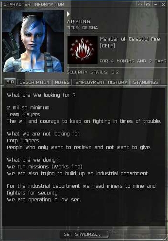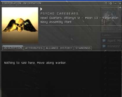 They are a 50 man corp located in Tash. Now this is one of the things that makes me laugh about this game. They claim one thing and then cry about it when you decide to test them. What do I mean you say? Let's take a look at their corp bio....
