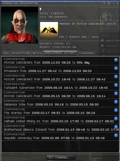 [ 2006.11.18 18:19:14 ] soul finder > ive been pirating since feb and ganked hundreds of ships and this is the only bounty i got, so i see you put isk on yourself