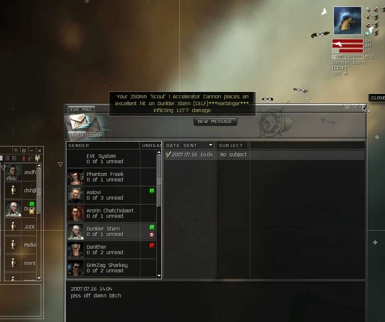The really funny thing is a little while later we manage to probe her out in a mission in Tash and popped the Raven. She immediately quit the corp.