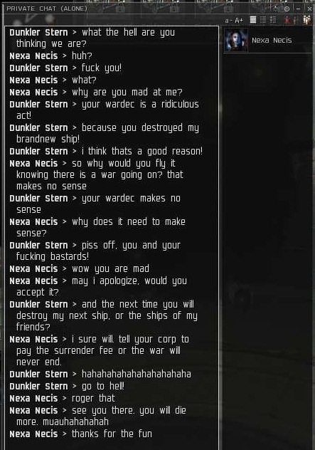 [ 2007.07.15 16:52:38 ] Nexa Necis > im aware of perception. read some of my other stories where war targets alwayss try to explain why its foolish to war dec them