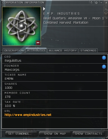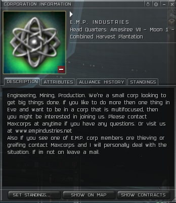 That said, the best reason I can give for this war, is a simple matter of conscience. If you were in EMP industries, and had lost as many ships as them, you'd probably welcome our assistance. We have a great PVP wing, and I'm sure we'll be fine against this 26 man corp (our alliance being 340 atm, about to hit 440 when EMP joins).