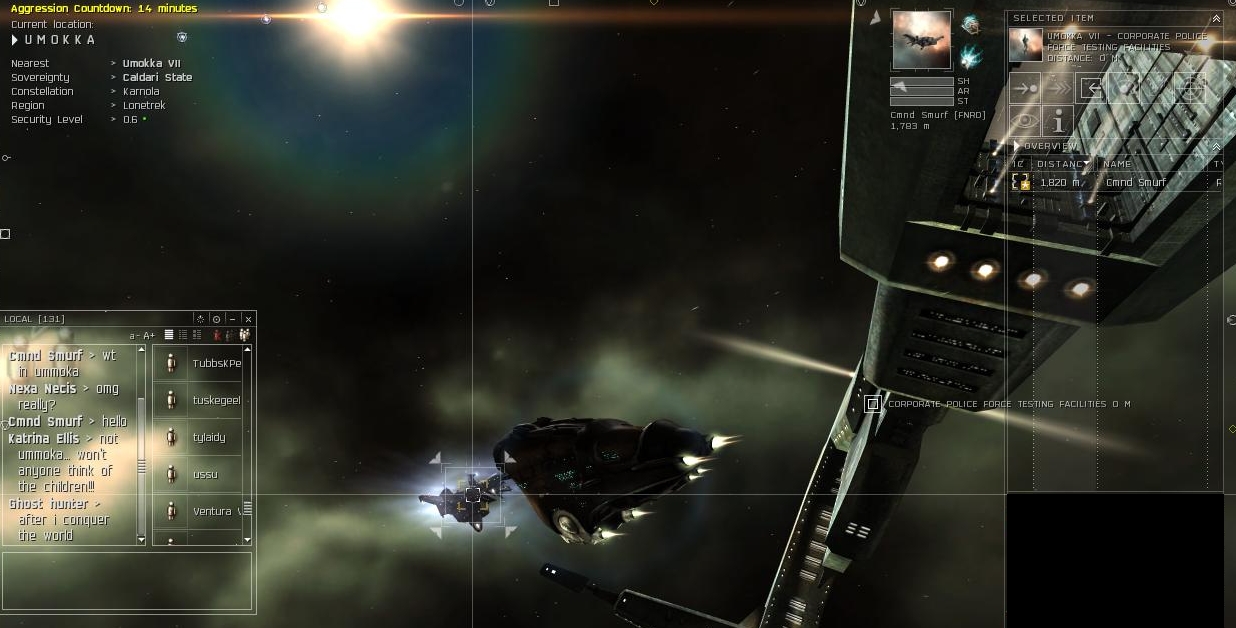 One night in Umokka I was trying to fight one of them. Of course they wouldn't do anything. Undock, redock over and over. He calls out a warning, but he messes up and puts it in local.