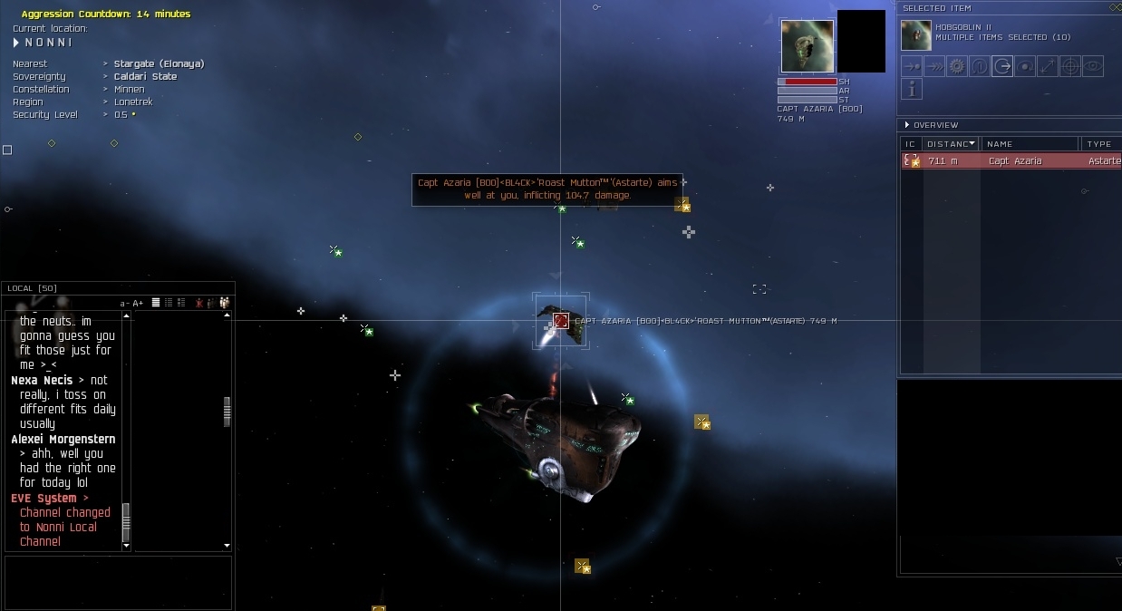 One of their guys, Capt. Azaria was always flying an Astarte. We managed to snag him one time and pop him. Then a few weeks later he showed up again. I think he was en route to help of of his friends we had just killed. My alt spotted him 2 jumps out. He was safespotted and MWD'ing to keep out of range of faction police. Apparently he was KOS in this region.