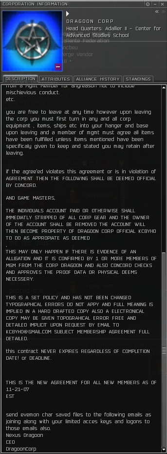 That Dragoon Corp "contract" was hilarious. Not only was it completely an asshole setup, it's also utterly, utterly nonenforceable. Not to mention the spelling of whomever wrote it is atrocious. I'd pay money to see the look on the GM's face when they get a petition about persecuting that contract.