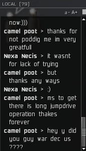 As goofy and newby as Camel was, he was genuinely a pretty nice guy. Easy to talk to and definitely aware of how to look at the big picture of Eve. I told him to read up on the forums, learn to fit a ship properly and think about creating his own corp. He had no problems stepping up to take care of his teammates without hesitation. That's a good quality to have for sure.