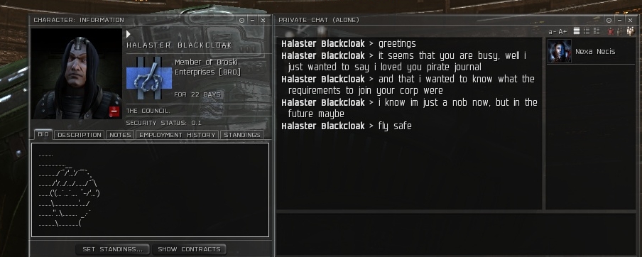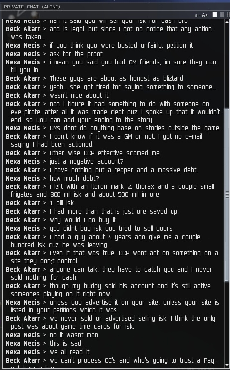 I also love his comment of how he wants to know how I work. I get this a lot. It's a charade of sorts. They play the role of curious when actually it's a thinly veiled attempt to probe me for anything they can use against me. As if I am going to say, "I do this because my corp sucks and we can't fight anyone who can pvp back." That's the answer they're looking for, which is stupid because it would mean they just got a severe beating by someone who admits they suck.